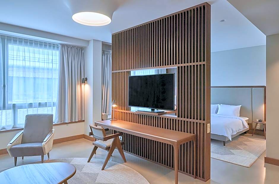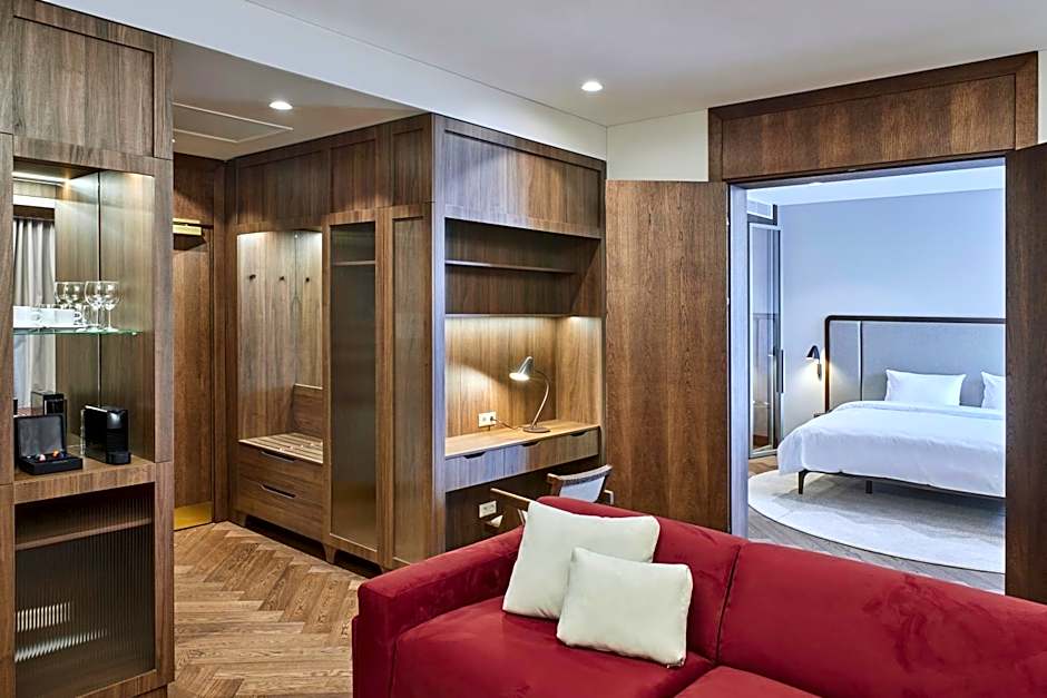 Suite consists of a spacious bedroom with a king size bed and a living room with a sofa-bed. It features 2 flat-screen TV's, wooden floor and a separate powder room.